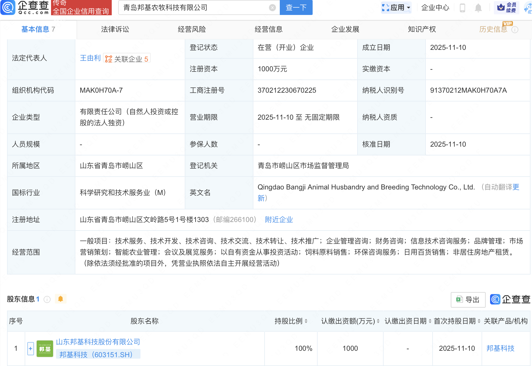近日,青岛邦基农牧科技有限公司成立,注册资本1000万元,经营范围包含:以自有资金从事投资活动;饲料原料销售;环保咨询服务;日用百货销售等。企查查股权穿透显示,该公司由邦基科技(603151)全资持股。